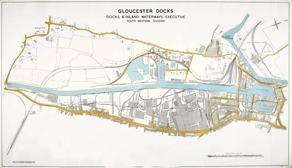 In the 1950s, goods passing through Llanthony Railway yard reflected the businesses in the local area and included; coal, timber, fertilizer, cement, paper, petrol, steel and sacks. Outbound goods leaving the docks, included scrap metal bound for Port Talbot, and bones –which were sent to Newport, South Wales for making glue. Now all that remains of the busy railway yard beside the Gloucester & Sharpness Canal are the quay wall, a former office building, and a derelict railway bridge spanning the East Channel of the River Severn at Alney Island. Some railway lines are still visible along the towpath.